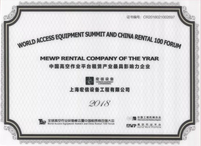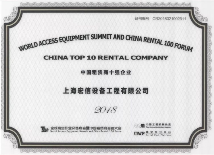 早在去年,宏信设备已被评为“中国高空作业租赁商十强”榜首。这次蝉联桂冠,体现了行业对宏信设备综合实力的进一步充分肯定。