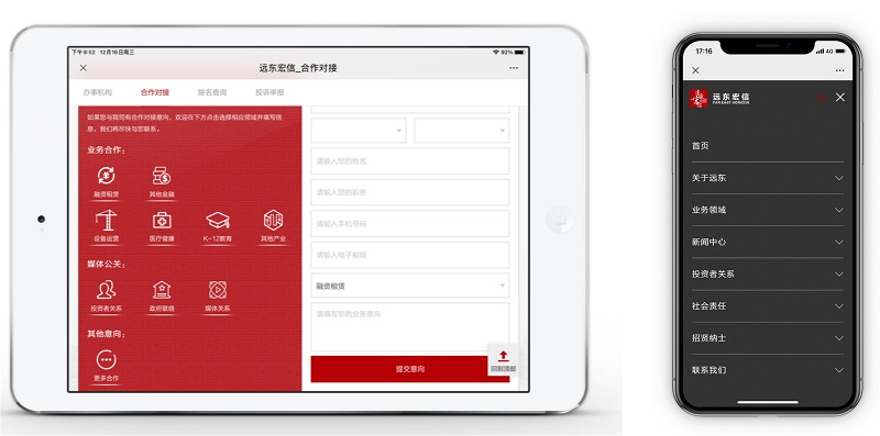 新官网的交互动效、互动功能、终端适配等也颇具用心。灵动的交互为美观的页面锦上添花,带来赏心悦目的阅读体验。“办事机构”栏目可查询定位远东全国20多个办事处,“合作对接”栏目可一键直达各条业务线。