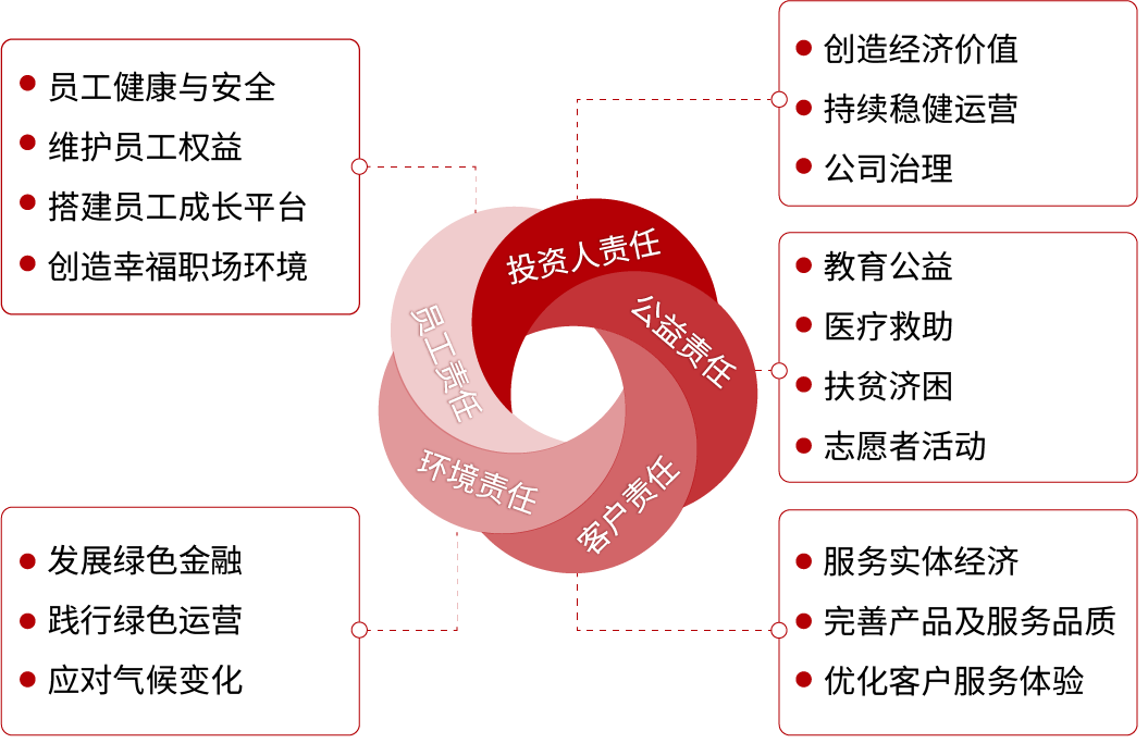 远东宏信作为一家横跨金融和产业的综合集团,以“汇聚全球资源、助力中国产业”为使命,秉承“创造价值分享,共铸和谐发展”的核心责任理念,在不断创新、开拓产业综合运营服务的同时,深耕投资人责任、客户责任、员工责任、环境责任、公益责任五大社会责任领域,促进产业经济及整个社会的健康、持续、稳定与和谐发展,为各利益相关方创造价值。