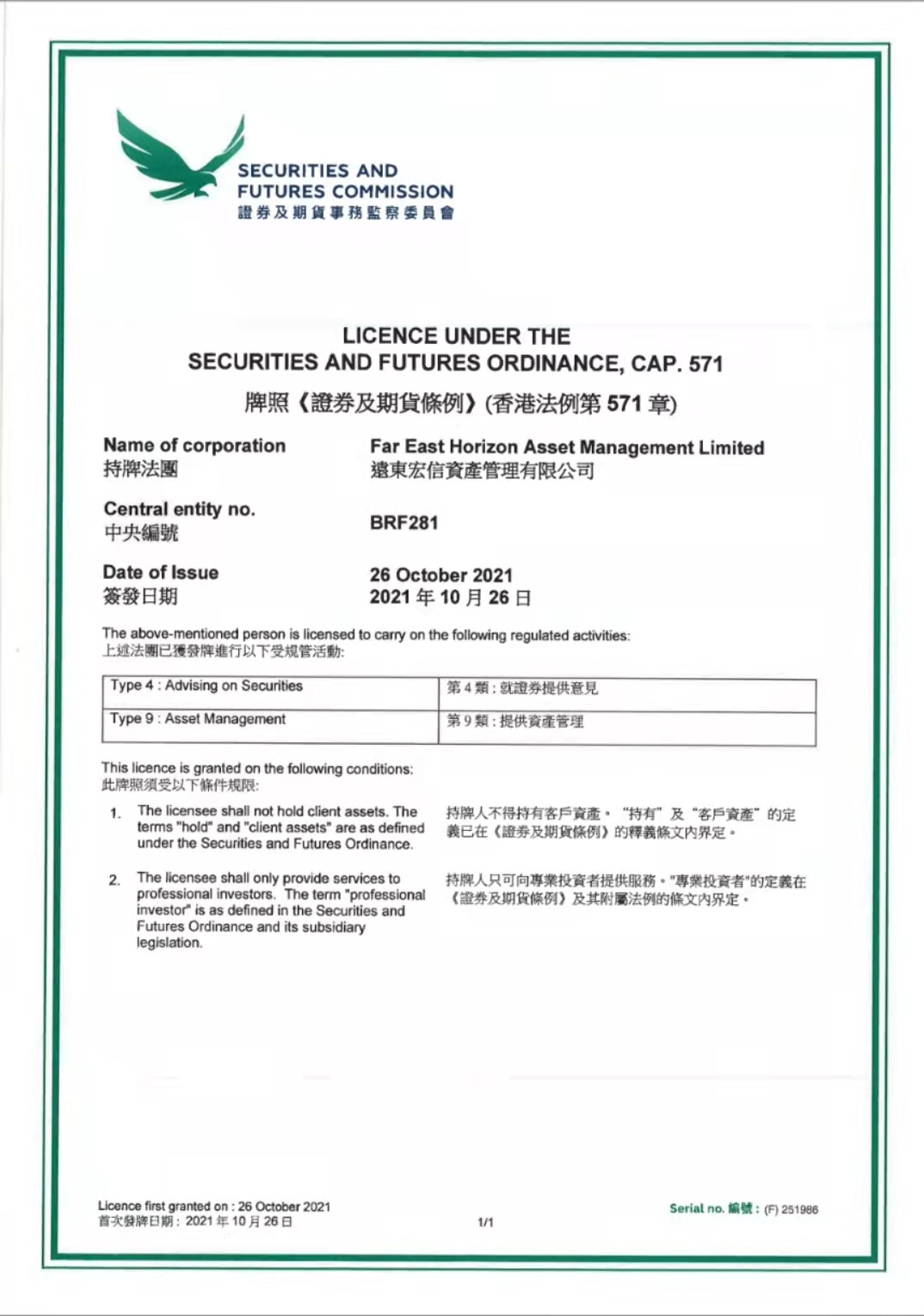 近日,远东宏信旗下远东宏信资产管理有限公司(以下简称“宏信资管”)经香港证监会批准,正式获发第4类“就证券提供意见”牌照及第9类“提供资产管理”牌照。