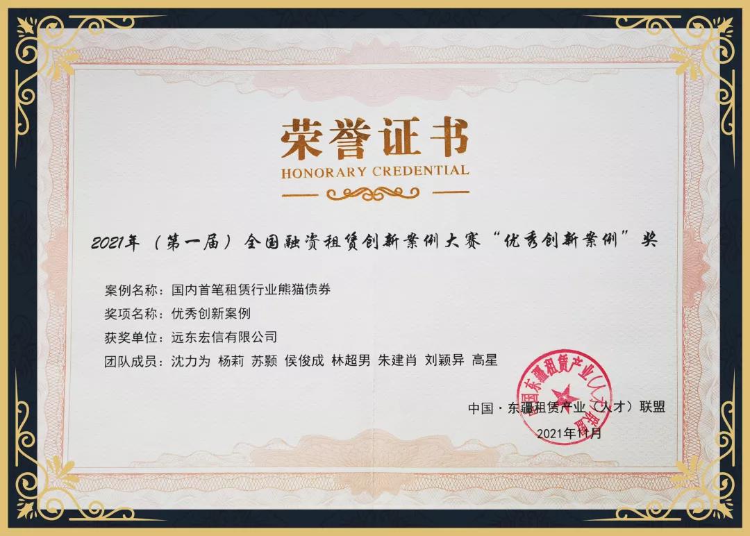 △远东宏信“国内首笔租赁行业熊猫债券”获2021年全国融资租赁创新案例大赛“优秀创新案例”奖