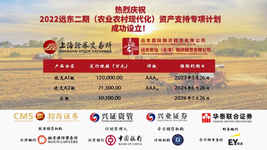 近日,远东国际融资租赁有限公司与远东宏信(天津)融资租赁有限公司成功发行2022远东二期(农业农村现代化)资产支持专项计划,发行总额为20.14亿元,这是远东在农业农村现代化ABS方面的第一单,充分体现了远东积极响应国家政策号召,不断将自身优势资源向农业农村现代化相关领域倾斜,赋能乡村振兴及农业农村现代化的企业责任。