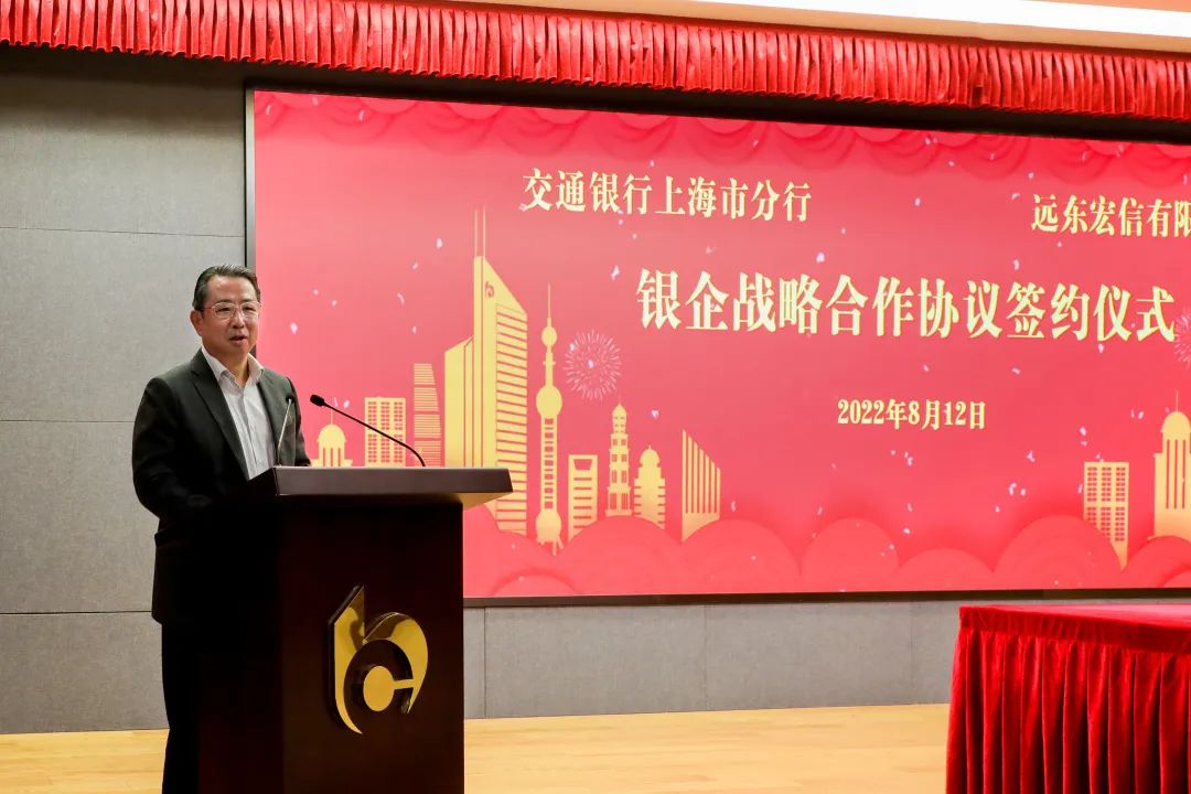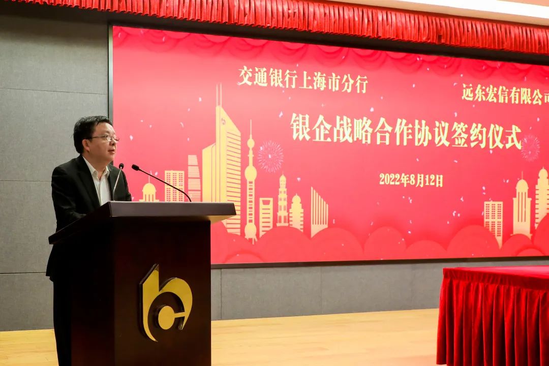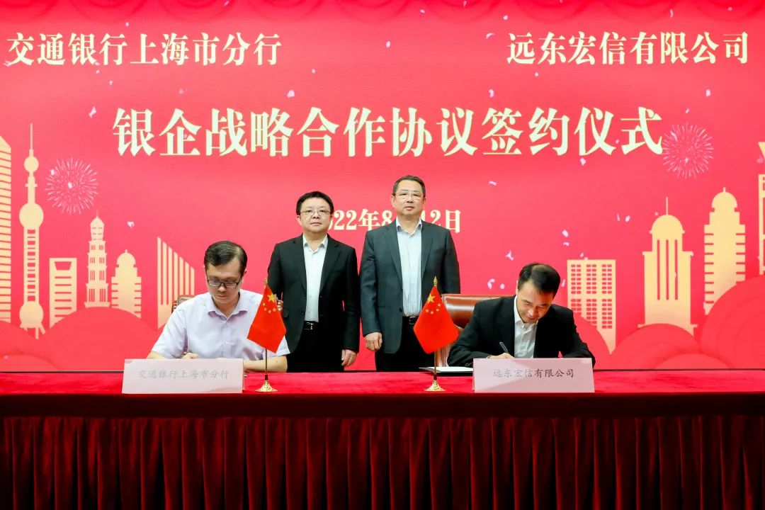 8月12日,远东宏信有限公司与交通银行上海市分行在上海举行银企战略合作协议签约仪式。远东宏信董事局副主席、执行董事、行政总裁孔繁星,交通银行总行业务总监、上海市分行党委书记、行长涂宏出席仪式并见证签约。远东宏信执行董事、财务总监王明哲,交通银行上海市分行党委委员、副行长宋滨代表双方签署协议。