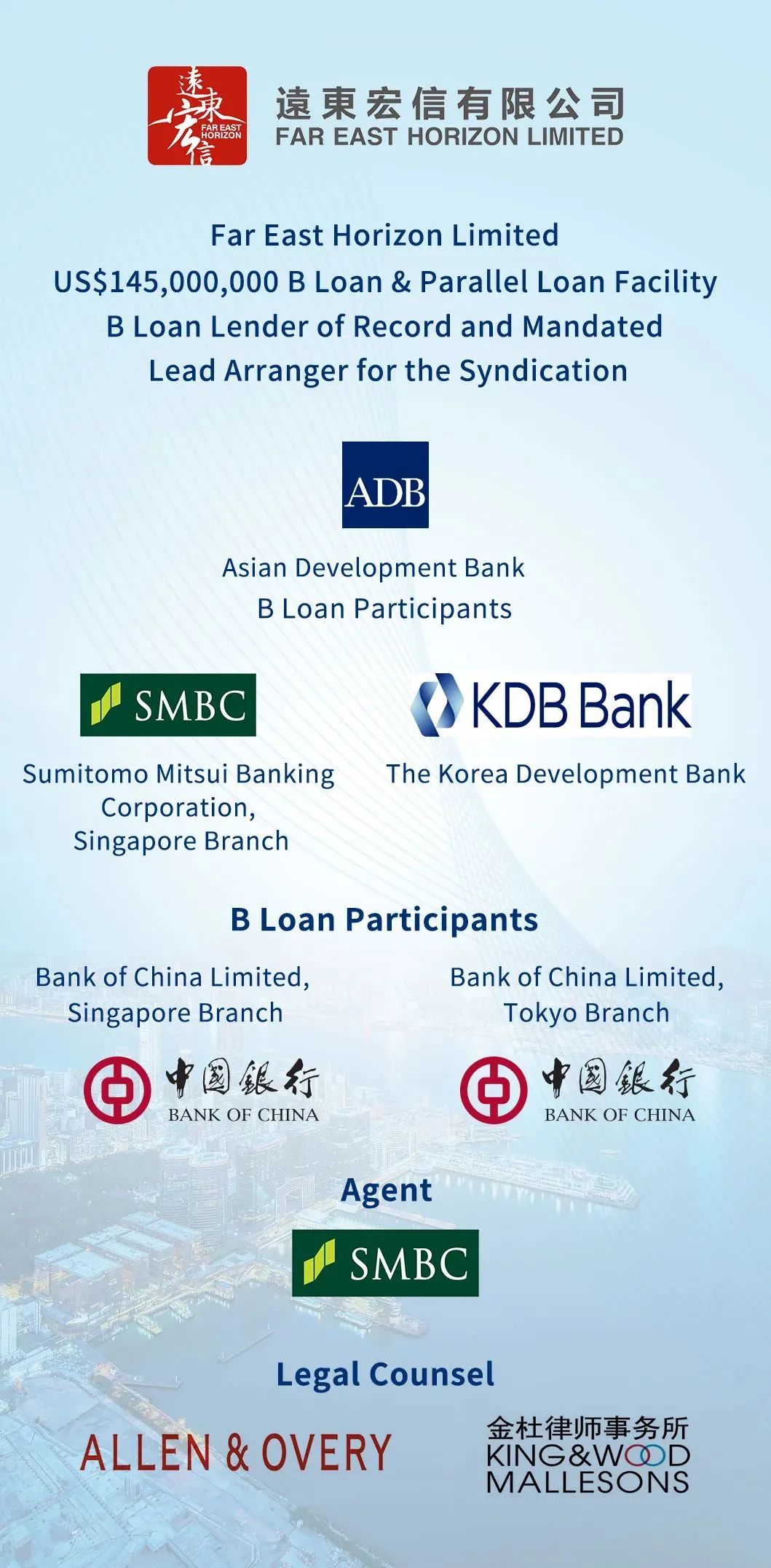 近日,亚洲开发银行作为委任牵头安排簿记行,为远东宏信提供了1.45亿美元的融资方案,资金将为中国的公立医院提供设备融资租赁,改善农村及偏远地区的医疗服务。该融资方案包括来自三井住友银行新加坡分行和韩国产业银行总计8500万美元的亚行B类联合融资,以及来自中国银行新加坡分行、中国银行东京分行的6000万美元平行贷款。未来,远东宏信将充分发挥海内外联动的桥梁和纽带作用,以全球化的视野引进资金和先进技术,为中国社会经济高质量发展添砖加瓦。