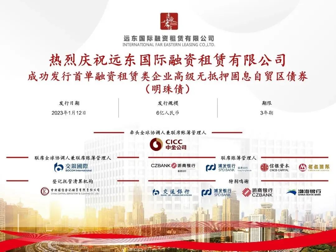 近日,远东宏信金融领域核心子公司——远东国际融资租赁有限公司,成功发行融资租赁行业首单自贸区离岸债券(明珠债),发行期限3年期,规模6亿元人民币,于澳门金交所挂牌上市。