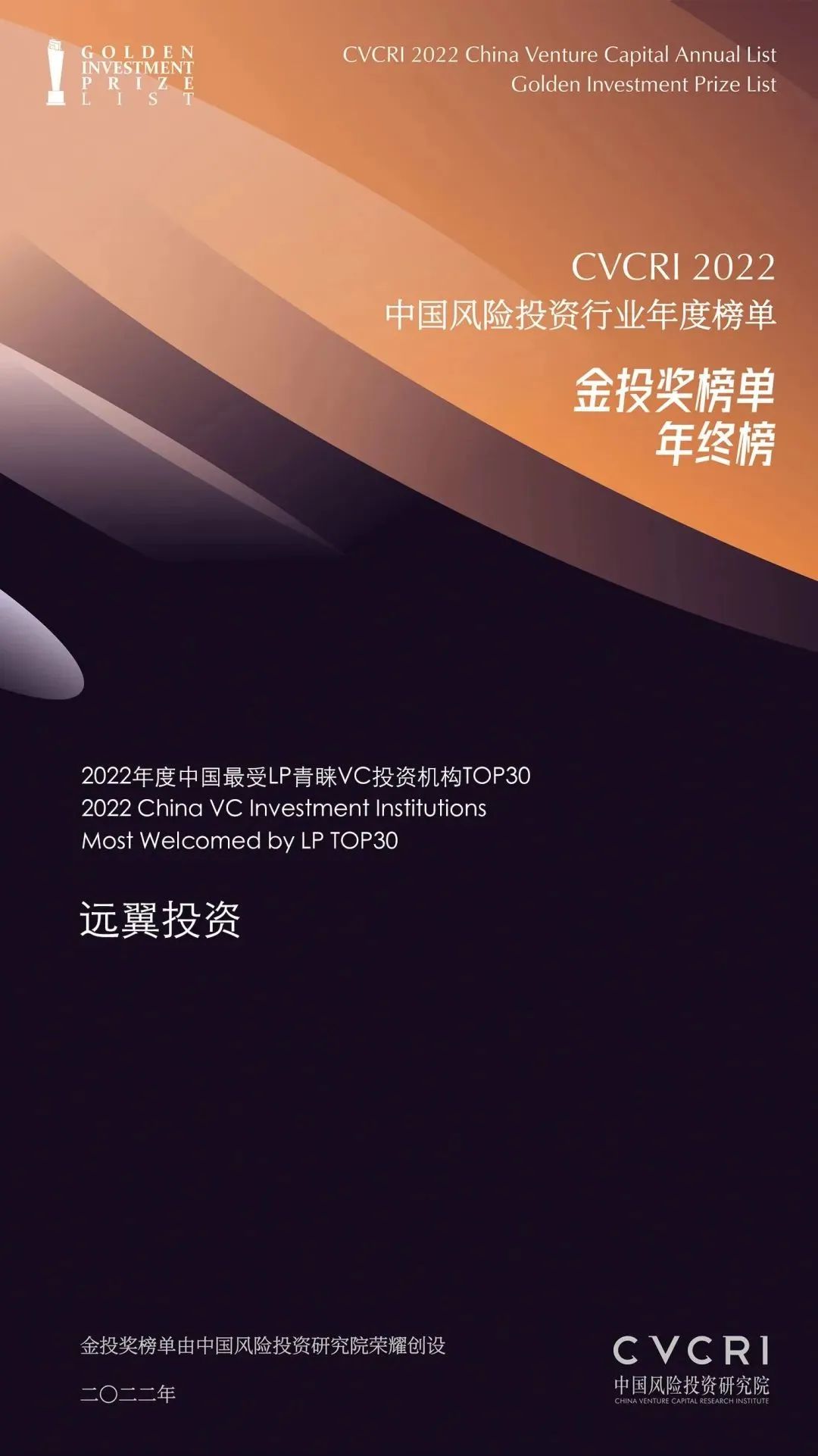 近期,备受关注的融中2022年度“中国股权投资榜单”以及CVCRI·2022中国风险投资行业年度榜单•金投奖榜单•年终榜重磅揭晓。凭借2022年在募、投、管、退的全方面成绩,远翼投资再次跻身两大评选主榜单,投资实力以及品牌价值再次彰显。远翼投资荣获中国风险投资研究院“2022年度中国最受LP青睐VC投资机构TOP30”。