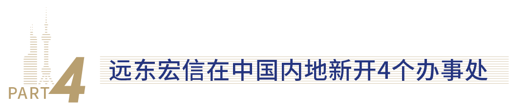 2023年一季度,远东宏信在中国内地相继开业4个新办事处,分别位于河北石家庄、浙江杭州、福建福州、内蒙古呼和浩特。截至目前,远东宏信在中国内地设立的运营中心和办事处已达31个,形成了紧密交织、高效覆盖的全国性服务网络,不断贴地的布局彰显了远东宏信背靠大陆市场持续发展的战略信心。二十多年来,基于办事处的长期运营与基础夯实,深耕区域、深耕产业已成为远东宏信最具特色的服务优势之一。