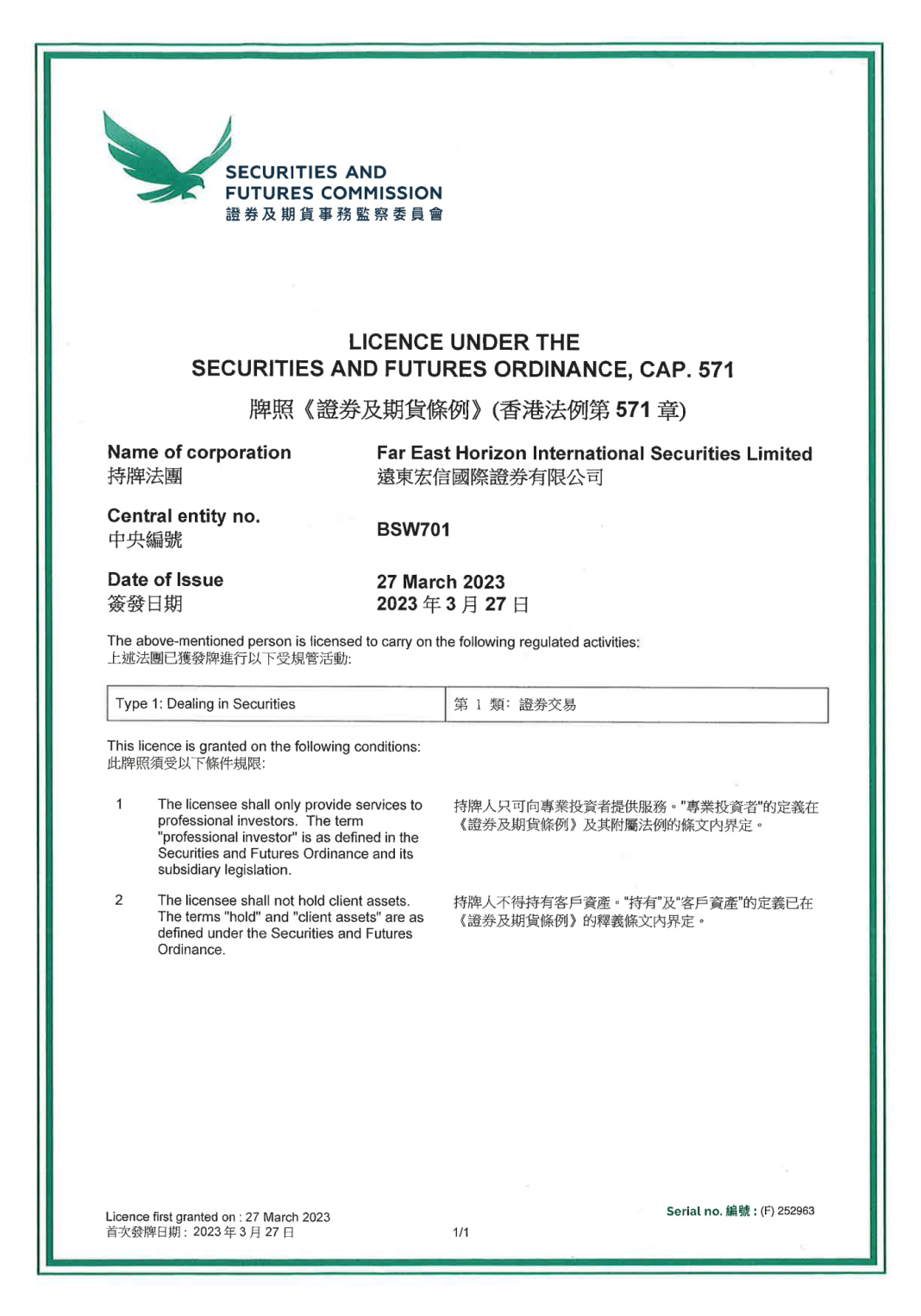近日,远东宏信旗下远东宏信国际证券有限公司经香港证监会批准,正式获发第1类“证券交易”牌照。至此,远东宏信已经获准在香港市场开展第1类“证券交易”、第4类“就证券提供意见”、以及第9类“资产管理”受规管业务。