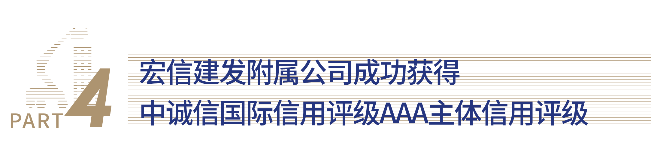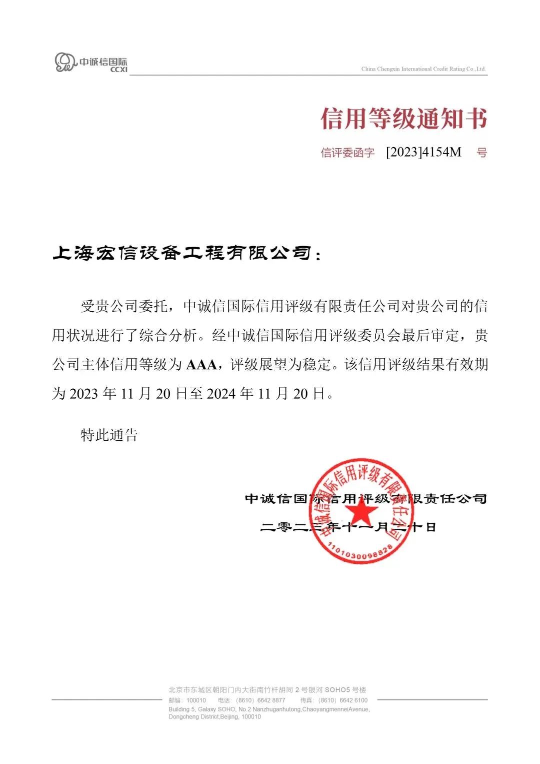 11月9日,宏信建设发展有限公司附属公司——上海宏信设备工程有限公司获得中诚信国际信用评级有限责任公司AAA主体信用评级,评级展望为“稳定”。宏信建发是行业细分领域内首家获得AAA主体信用评级的设备综合运营服务商,本次附属公司获得AAA主体信用评级将进一步增强其市场竞争力和影响力。