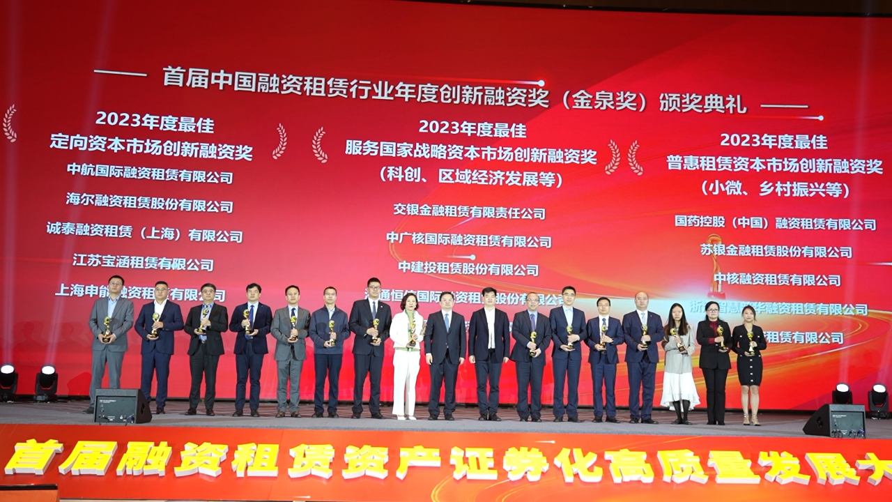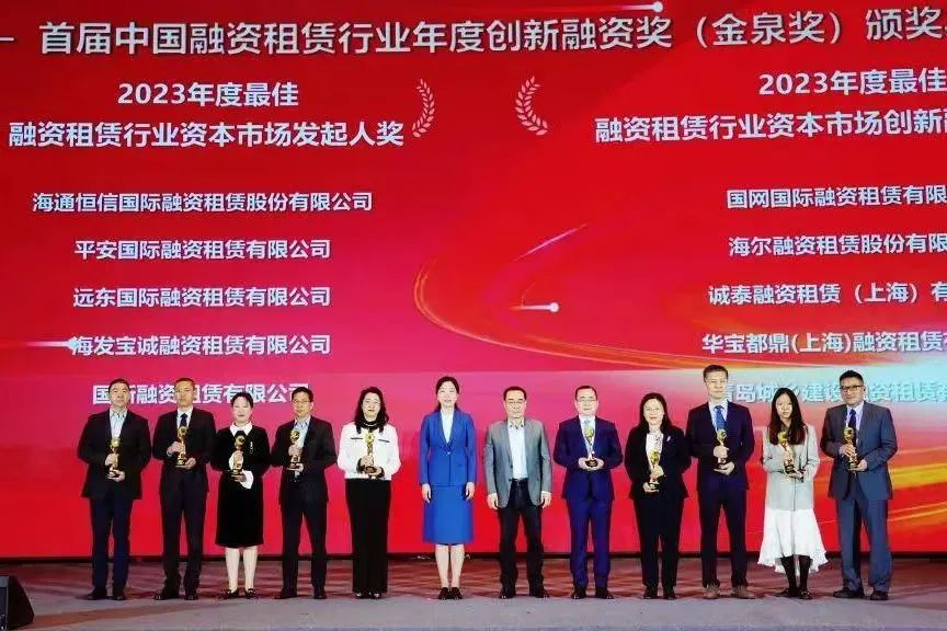 近日,首届中国融资租赁行业年度创新融资奖(金泉奖)在上海揭晓,远东宏信租赁“2023年面向专业投资者公开发行公司债券(第一期)(可持续挂钩)”荣获“2023年度最佳服务国家战略资本市场创新融资奖”,并凭借长期以来创新金融产品的持续发行,荣获“2023 年度最佳融资租赁行业资本市场发起人奖”,这是对公司通过创新金融产品助力国家顺利实现双碳目标、推动实现农业农村现代化发展目标、 支持中小微企业创新活力和发展动力等方面的充分肯定。远东宏信副总裁徐会斌、资金中心总经理沈力为出席活动并代表公司领奖。