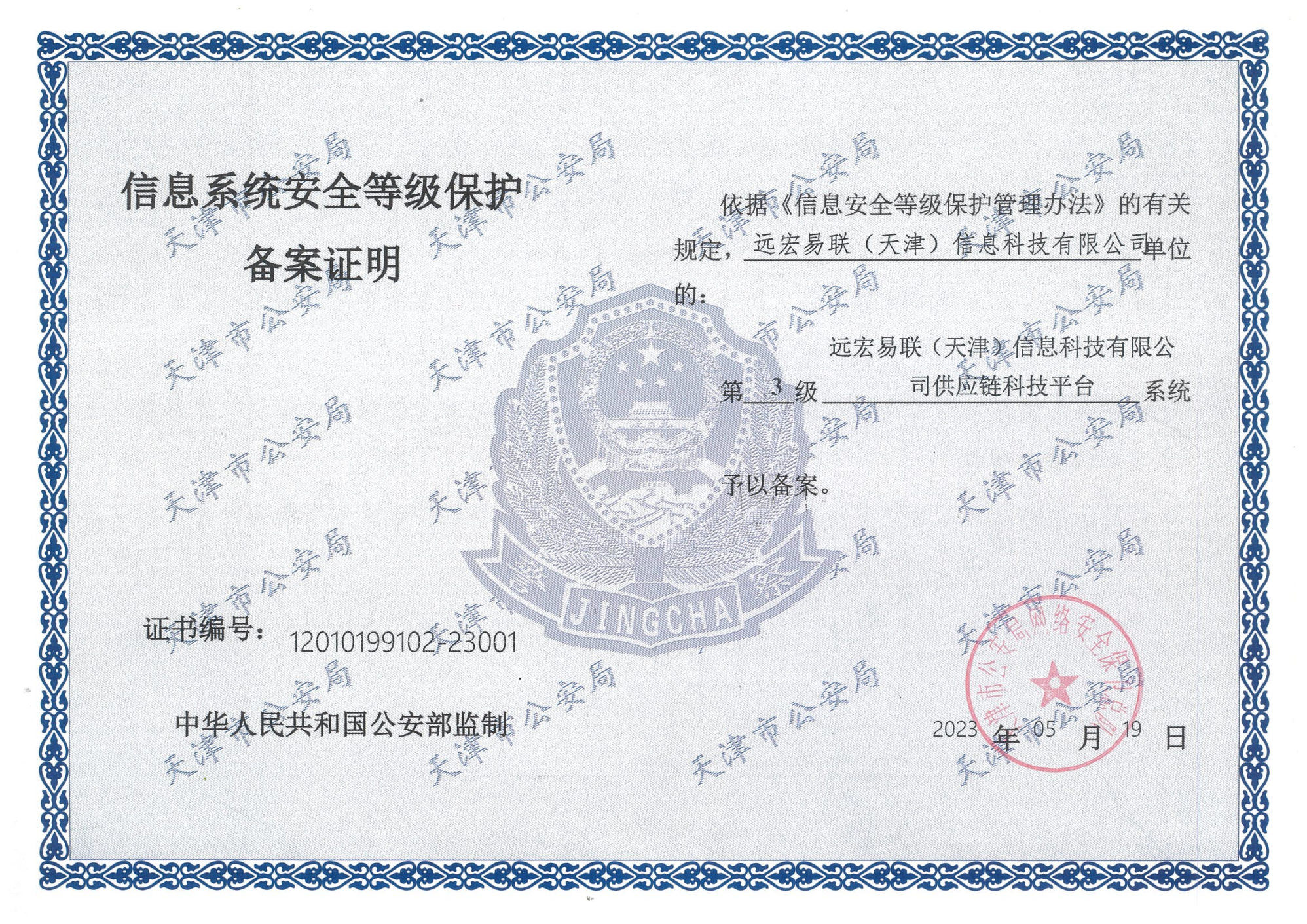 2023年,远宏易联科技平台已取得网安信息系统安全等级保护三级备案证明,达到金融行业较高水平。平台可在客户注册、开立电子凭证、签章等多个环节进行数据加密存证。取证环节,可由CFCA、互联网法院等机构出具有效力的存证报告,避免数据篡改、伪造导致信任危机。