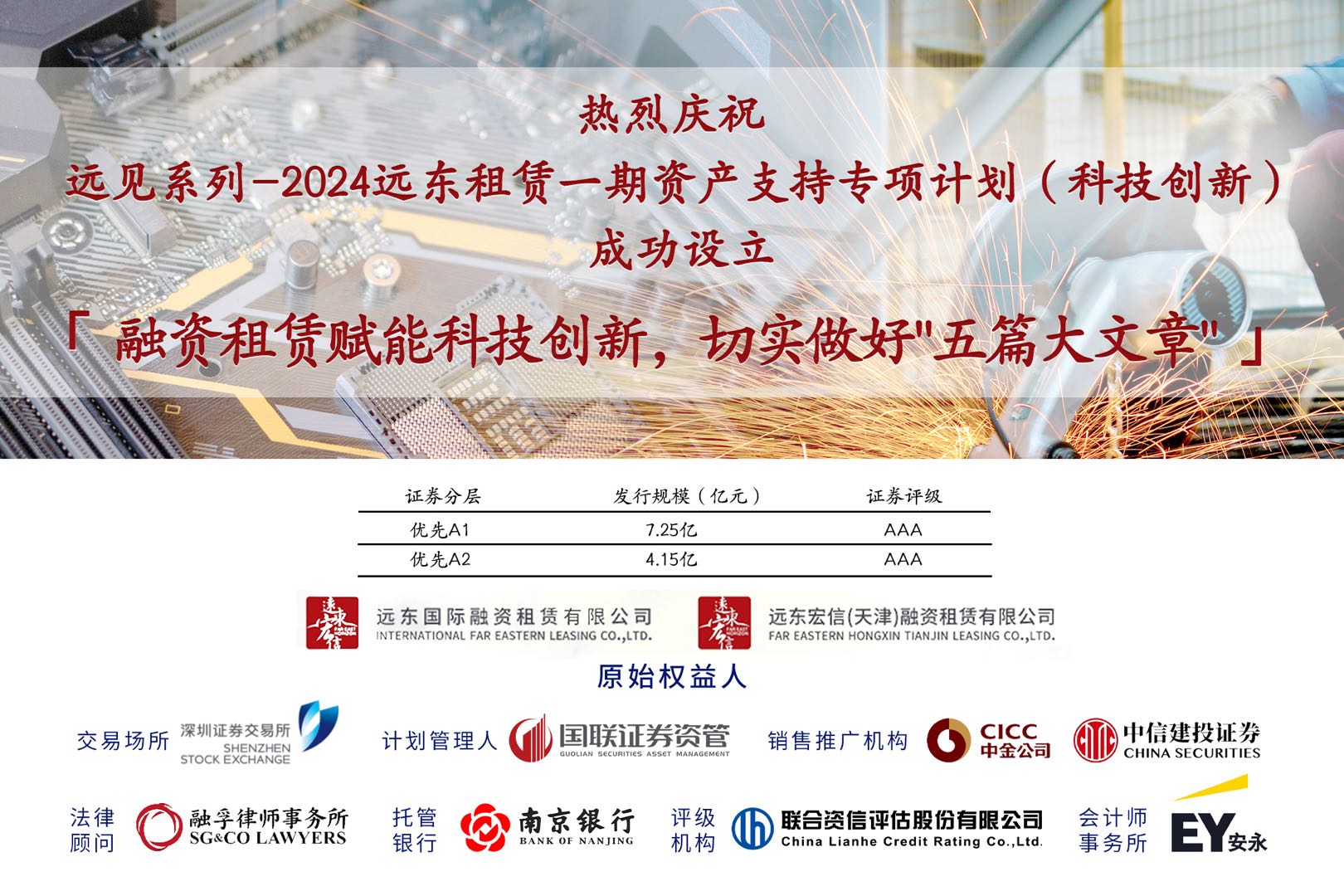 近日,远东国际融资租赁有限公司和远东宏信(天津)融资租赁有限公司在深圳证券交易所成功发行远见系列-2024远东租赁一期资产支持专项计划(科技创新)(以下简称“专项计划”),该专项计划发行规模约12亿元,底层资产主要覆盖了国家科技金融战略支持的科技行业,吸引了众多投资者的踊跃参与。该专项计划的成功发行充分体现了远东宏信发展多元化特色金融服务,是公司全力赋能科技企业,助力新质生产力发展的又一生动实践。