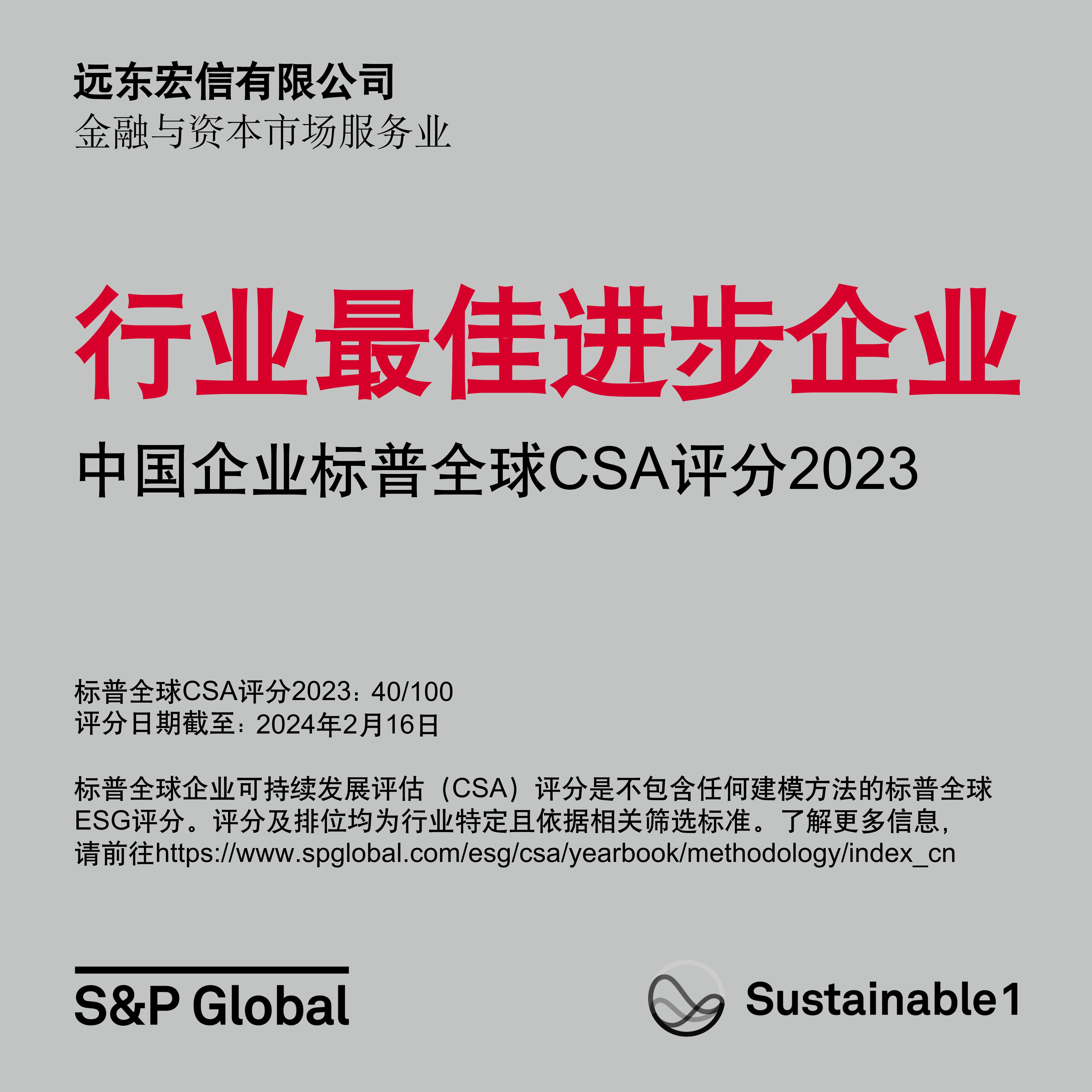 回溯2023年标普全球企业可持续发展评估,远东宏信便以40分的CSA分数入选《可持续发展年鉴(中国版)》,荣获“行业最佳进步企业”特别表彰,并成功入选标普全球大中盘ESG指数。