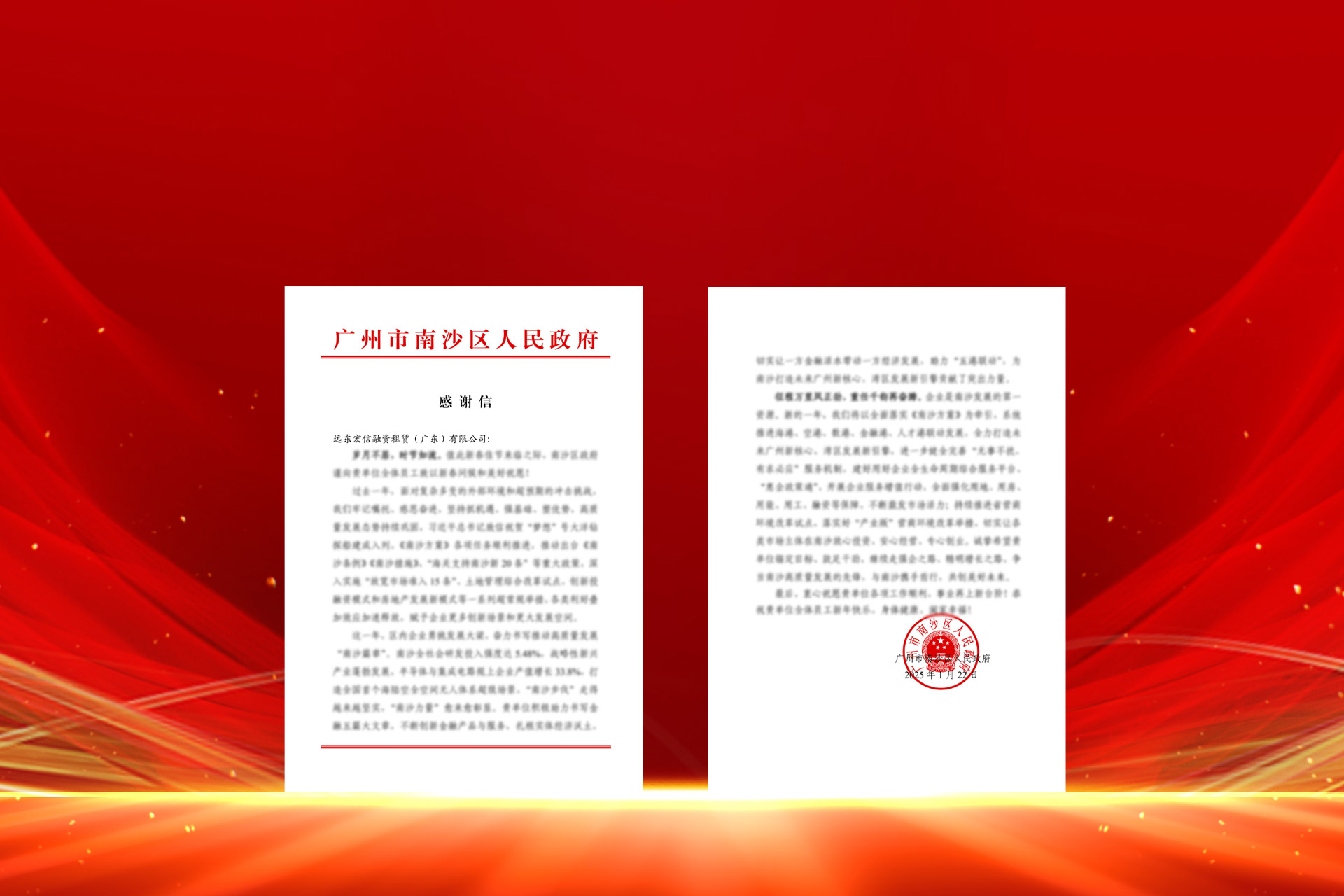 农历蛇年新春佳节前夕,广州市南沙区政府,广州市委常委、南 沙区委书记刘炜,南沙区委常委、区长吴扬先后向远东宏信及公司领 导发来新春感谢信,高度肯定公司 2024 年经营成果,并对公司为南 沙区发展所作出的突出贡献表达诚挚感谢。新的一年,远东宏信将秉 持合作共赢的理念,持续深化与南沙的合作,切实服务实体经济,推 动南沙经济发展实现质的突破和量的提升。