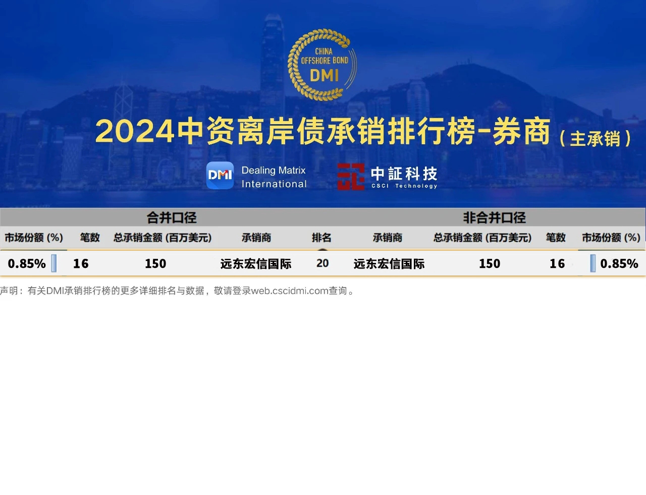 近日,中证信用科技债券领域综合信息服务平台DMI发布2024中资离岸债承销榜单,远东宏信国际首次强势跻身券商主承销商前20。作为远东宏信旗下持香港1号牌照的专业债券平台,远东宏信国际依托集团资源稳步崛起,2024年完成超40单一级债承销项目,业务覆盖山东、河南等十余省份,有效拓宽地方政府融资渠道,提升国际信誉。未来,公司将深度聚焦城市服务领域,持续为区域经济高质量发展提供金融支持。