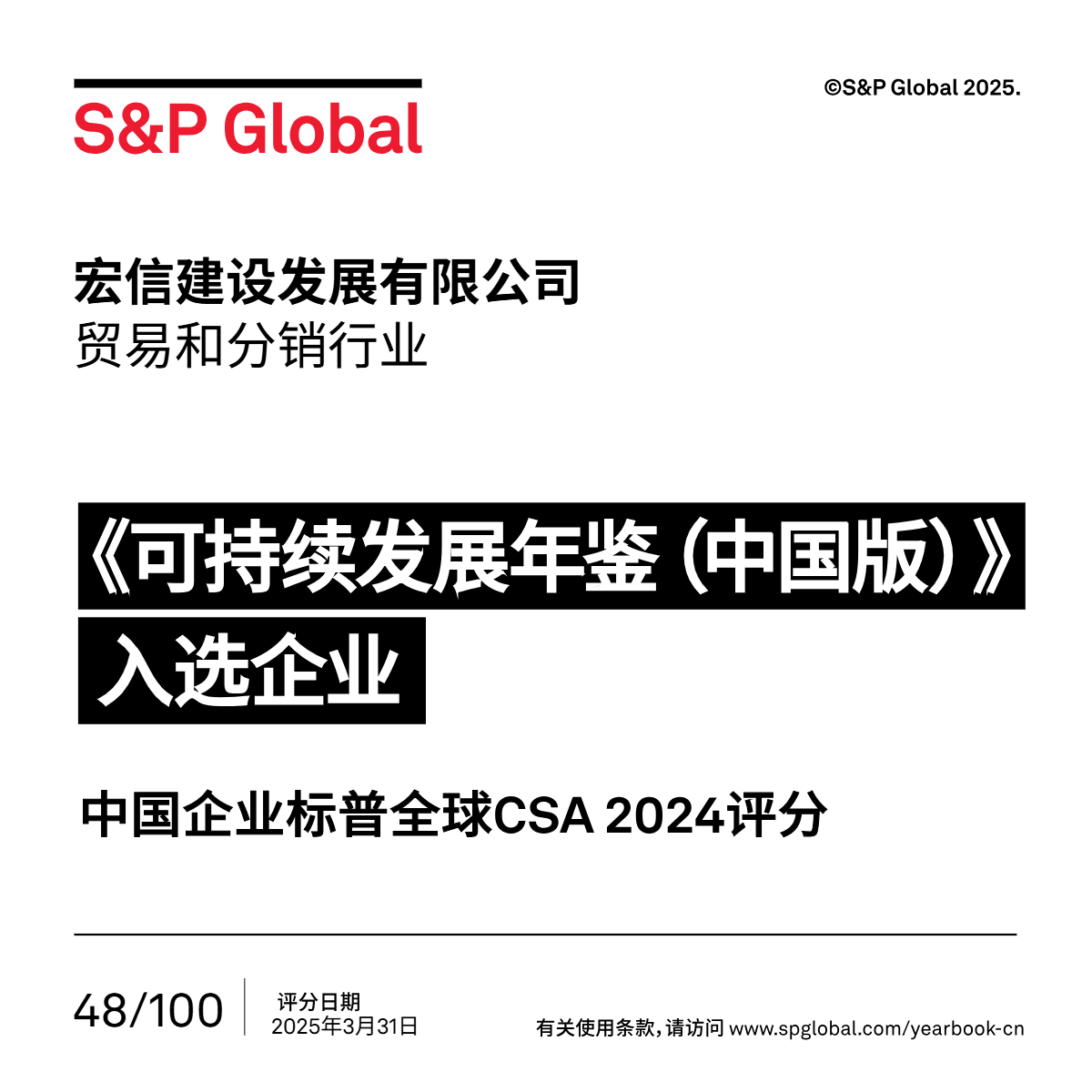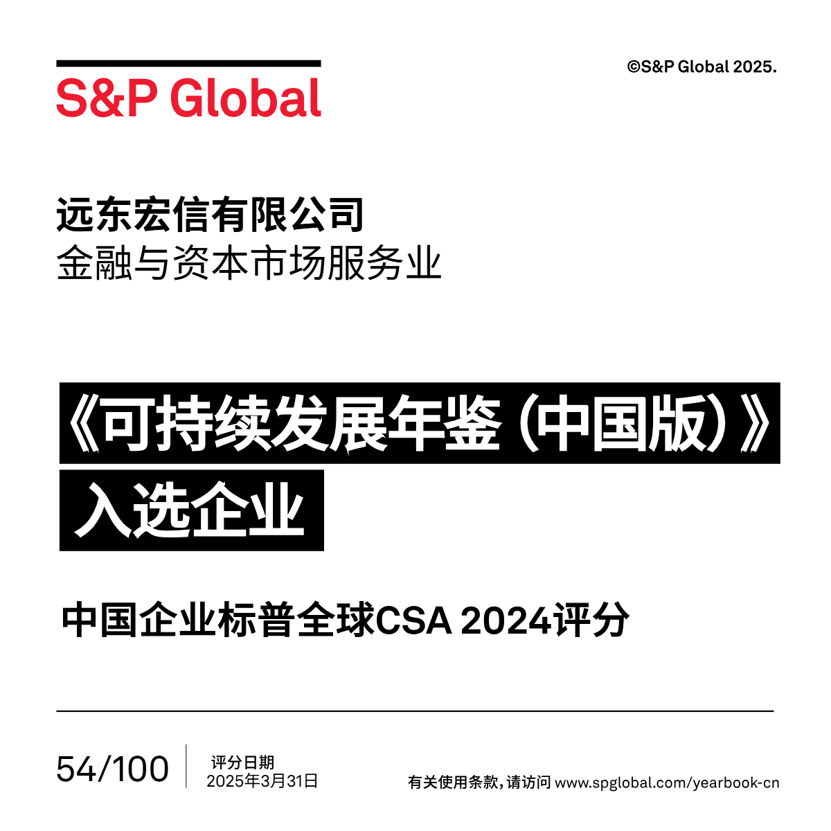 4月16日,标普全球(S&P Global)正式发布《可持续发展年鉴(中国版)2025》。远东宏信凭借54分的企业可持续发展评估(CSA)评分入选该年鉴,位列该年鉴金融与资本市场服务行业入选企业的TOP3,展现出公司在可持续发展领域的强劲动能。