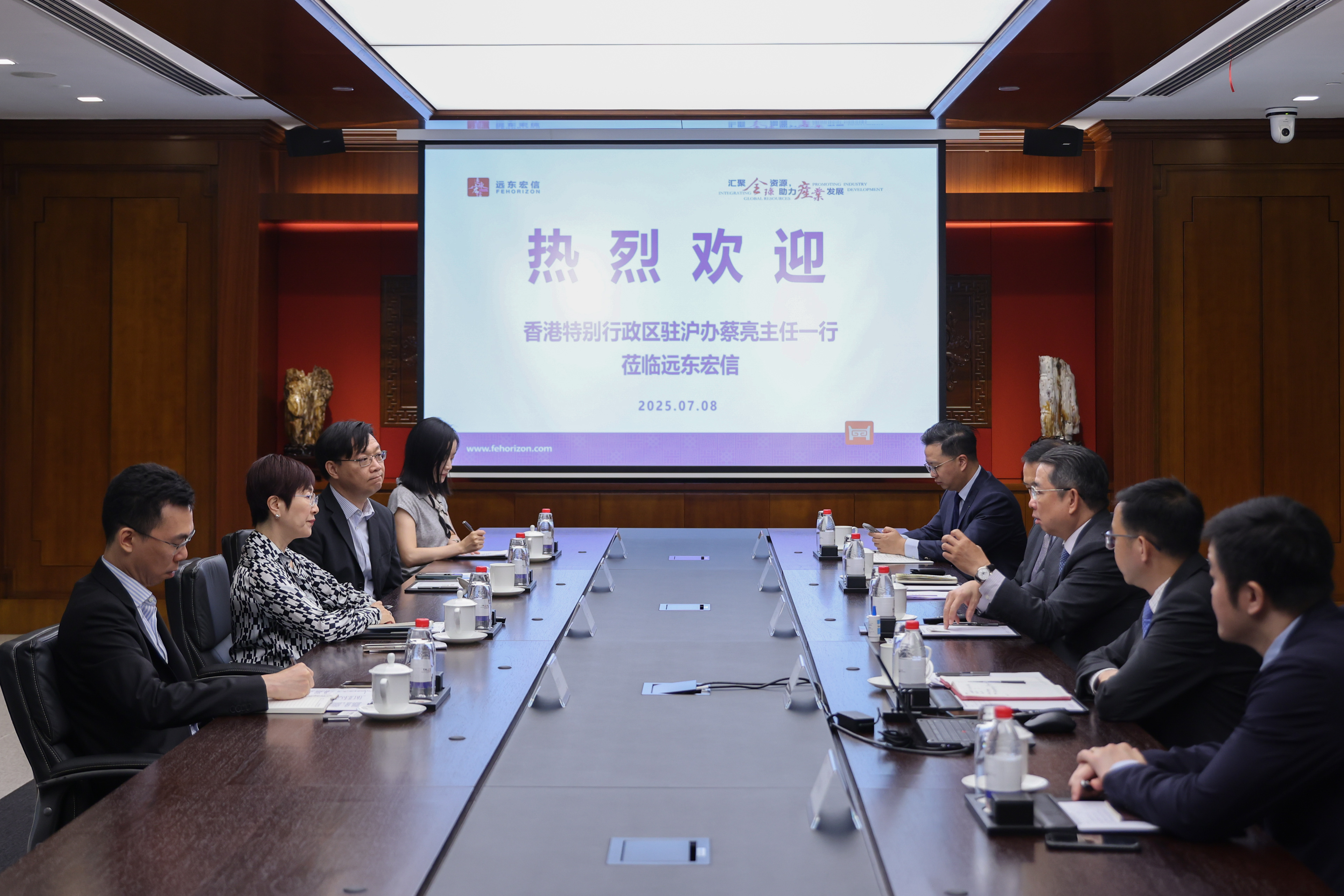 香港特别行政区驻沪办副主任林景富、经贸关系总监马明亮、经贸关系经理赵文;远东宏信执行董事、财务总监王明哲,副总裁徐会斌,投资者关系部总经理张拳拳共同出席会谈。