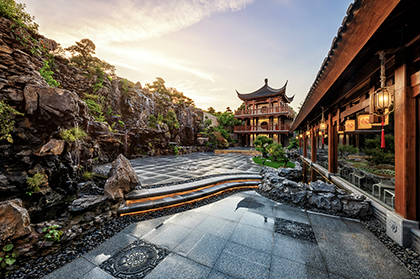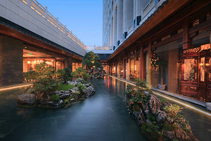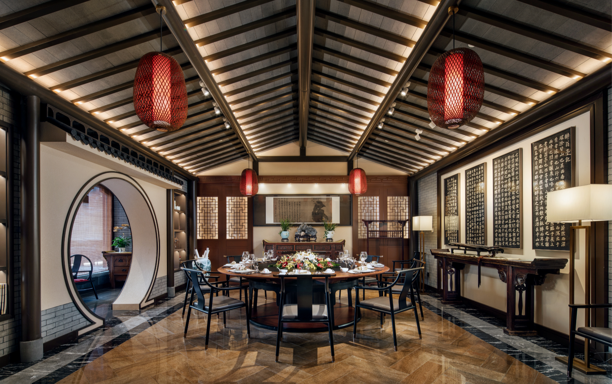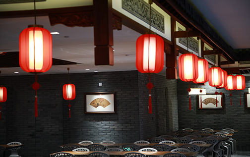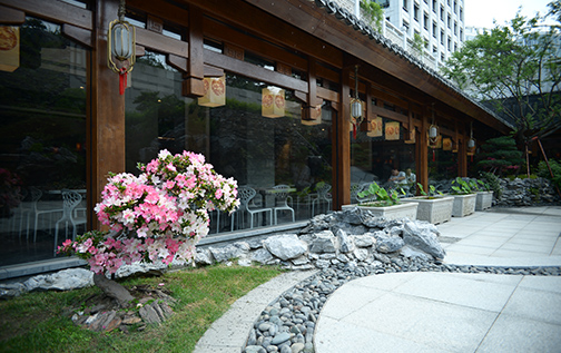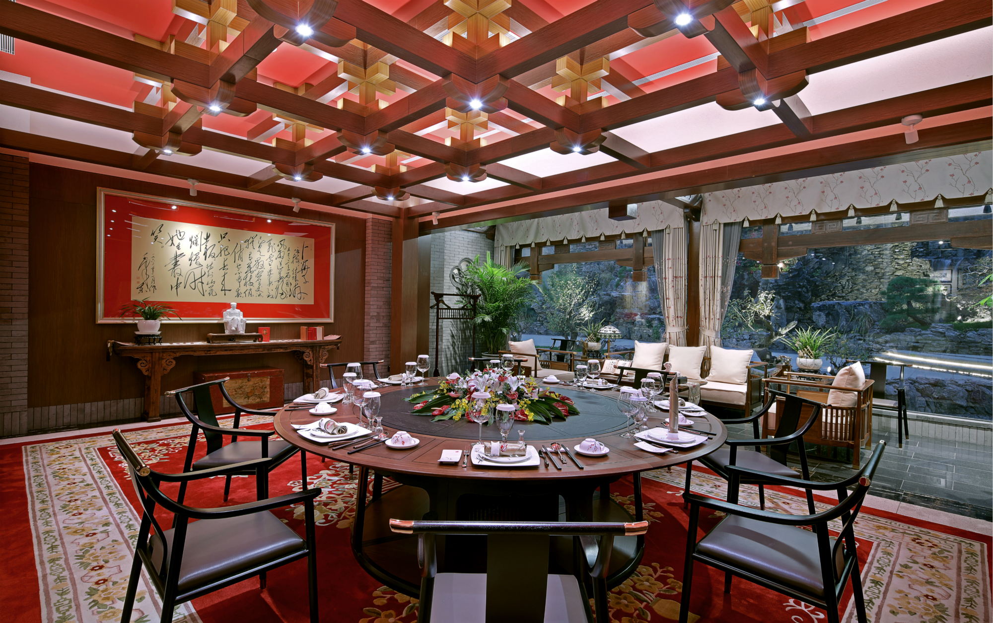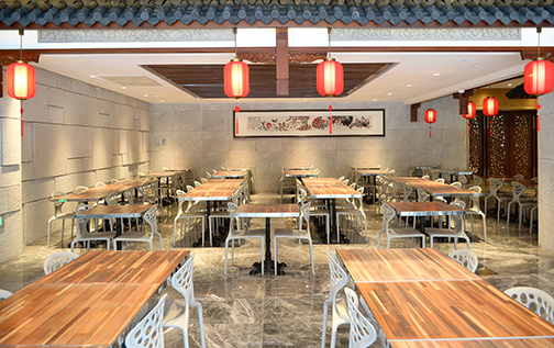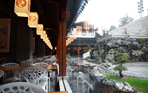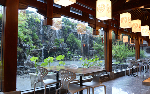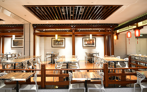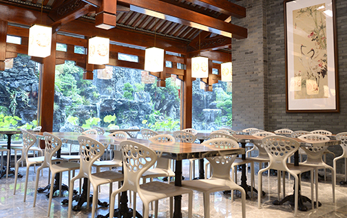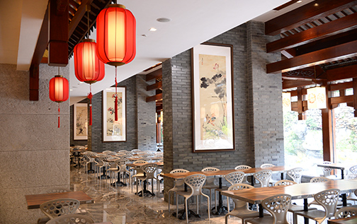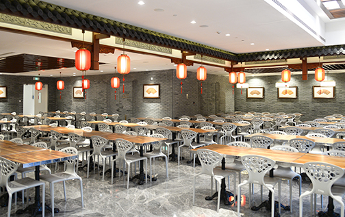 就餐环境:宏信食堂的建筑设计提炼了亭、廊、屋檐、砖雕、铜饰等中国古建元素,古色古香、典雅庄重。食堂窗外恰对“梅亭望瀑”景观,亭台楼阁,流水潺潺,秀色可餐,仿佛置于山水之间,成为宏信食堂一道绝佳的风景线。
